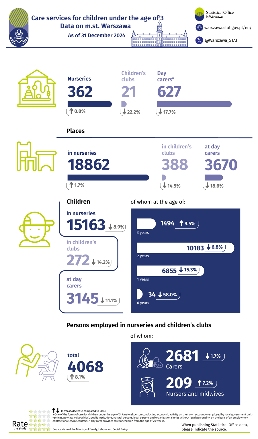 Care services for children under the age of 3 Data on m.st. Warszawa A A A 19.09.2025 Evaluate the study: Downloads Care services for children under the age of 3 Data on m.st. Warszawa 1.44 MB Archive 2022 Care services for children under the age of 3 Data on m.st. Warszawa Nurseries and children’s clubs in Warszawa 2021 Nurseries and children’s clubs in Warszawa 2020 Nurseries and children’s clubs in Warszawa