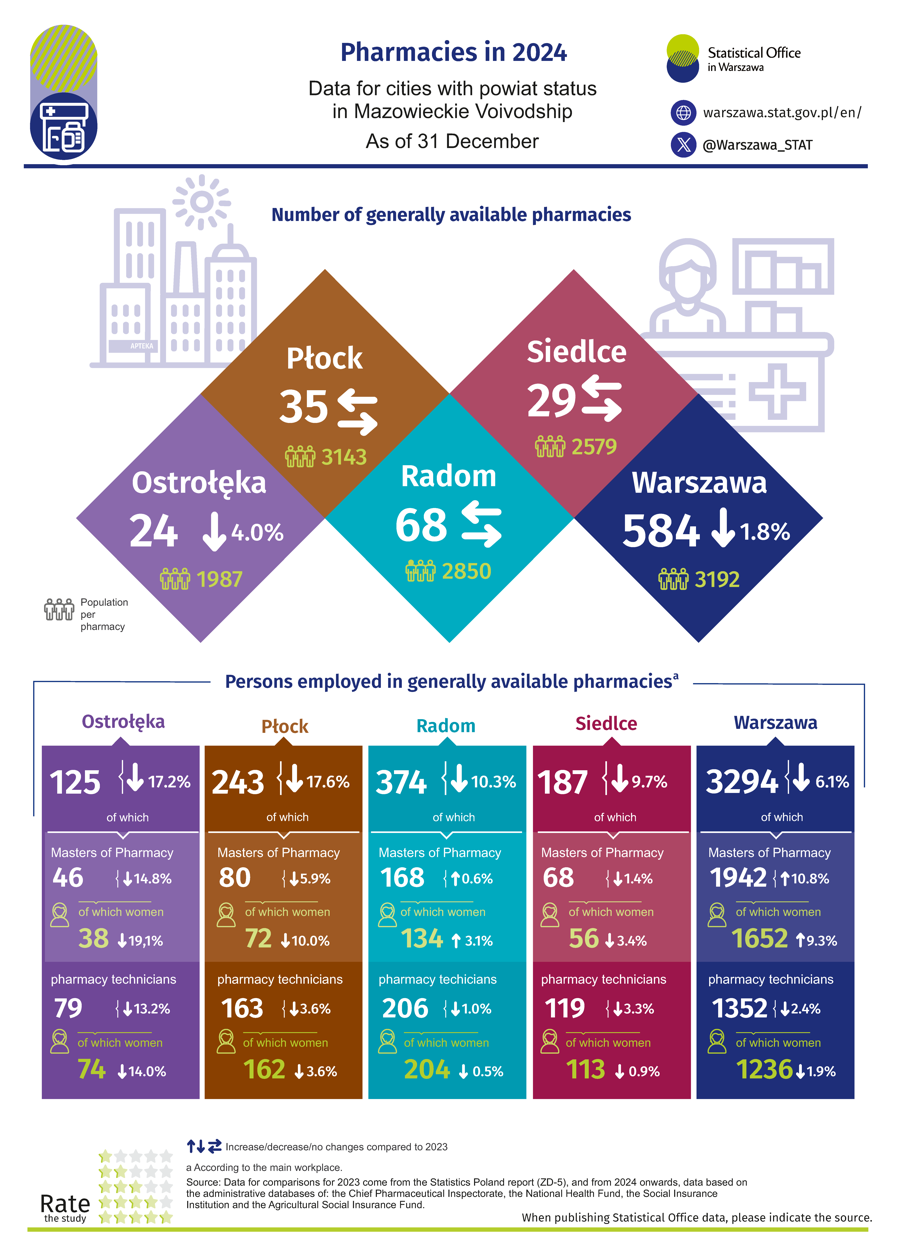 Pharmacies in 2024 - data for cities with powiat status in Mazowieckie Voivodship A A A 26.09.2025 Evaluate the study: Downloads Pharmacies in 2024 - data for cities with powiat status in Mazowieckie Voivodship 1.43 MB