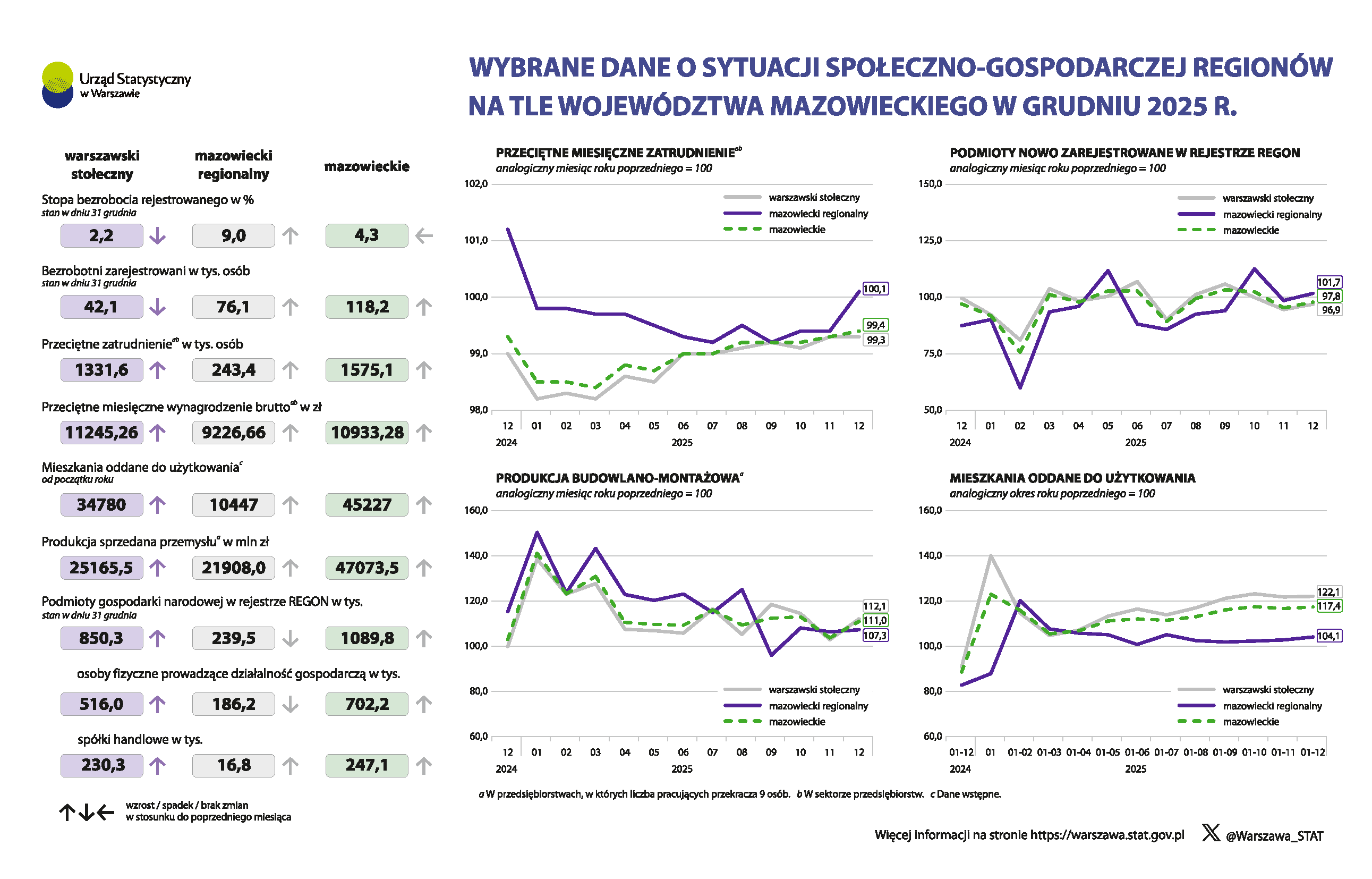 Wybrane dane o sytuacji społeczno-gospodarczej regionów na tle województwa mazowieckiego w grudniu 2025 r. A A A 30.01.2026 Oceń opracowanie: Pliki do pobrania Wybrane dane o sytuacji społeczno-gospodarczej regionów na tle województwa mazowieckiego w grudniu 2025 r. 1.58 MB Wybrane dane o sytuacji społeczno-gospodarczej regionów na tle województwa mazowieckiego w grudniu 2025 r. - wersja o wysokim kontraście dla niedowidzących 1.58 MB Wybrane dane o sytuacji społeczno-gospodarczej regionów na tle województwa mazowieckiego w grudniu 2025 r. - dane w formacie Excel 0.06 MB