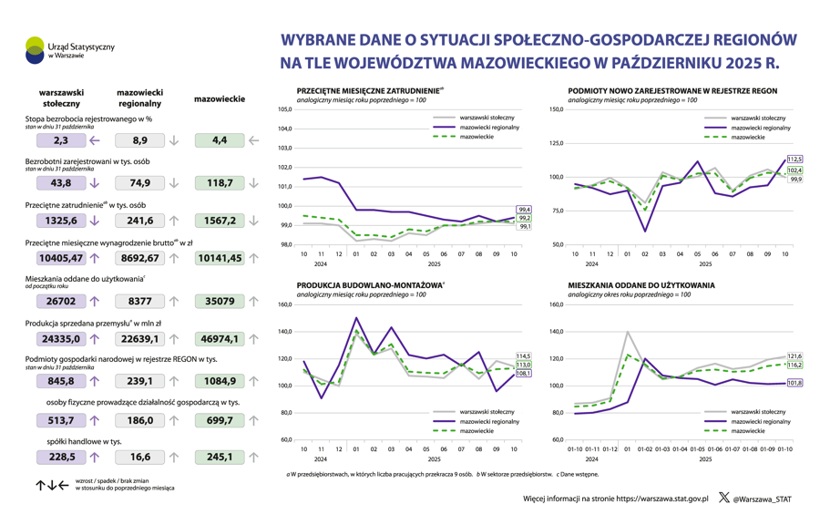 Wybrane dane o sytuacji społeczno-gospodarczej regionów na tle województwa mazowieckiego w październiku 2025 r. A A A 27.11.2025 Oceń opracowanie: Pliki do pobrania Wybrane dane o sytuacji społeczno-gospodarczej regionów na tle województwa mazowieckiego w październiku 2025 r. 1.58 MB Wybrane dane o sytuacji społeczno-gospodarczej regionów na tle województwa mazowieckiego w październiku 2025 r. - wersja o wysokim kontraście dla niedowidzących 1.58 MB Wybrane dane o sytuacji społeczno-gospodarczej regionów na tle województwa mazowieckiego w październiku 2025 r. - dane w formacie Excel 0.06 MB
