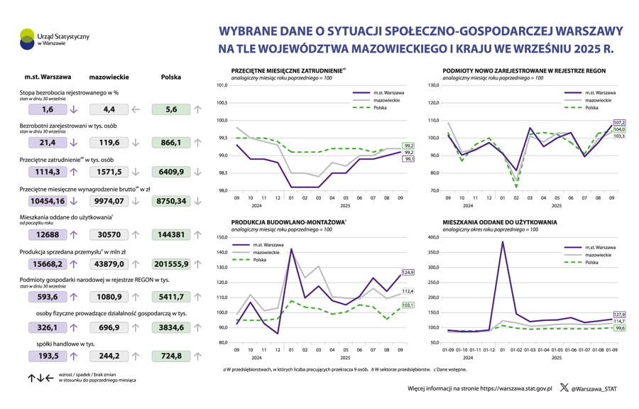 Wybrane dane o sytuacji społeczno-gospodarczej Warszawy na tle województwa mazowieckiego i kraju we wrześniu 2025 r. A A A 28.10.2025 Oceń opracowanie: Pliki do pobrania Wybrane dane o sytuacji społeczno-gospodarczej Warszawy na tle województwa mazowieckiego i kraju we wrześniu 2025 r. 1.57 MB Wybrane dane o sytuacji społeczno-gospodarczej Warszawy na tle województwa mazowieckiego i kraju we wrześniu 2025 r. - wersja o wysokim kontraście dla niedowidzących 1.57 MB Wybrane dane o sytuacji społeczno-gospodarczej Warszawy na tle województwa mazowieckiego i kraju we wrześniu 2025 r. - dane w fromacie Excel 0.06 MB