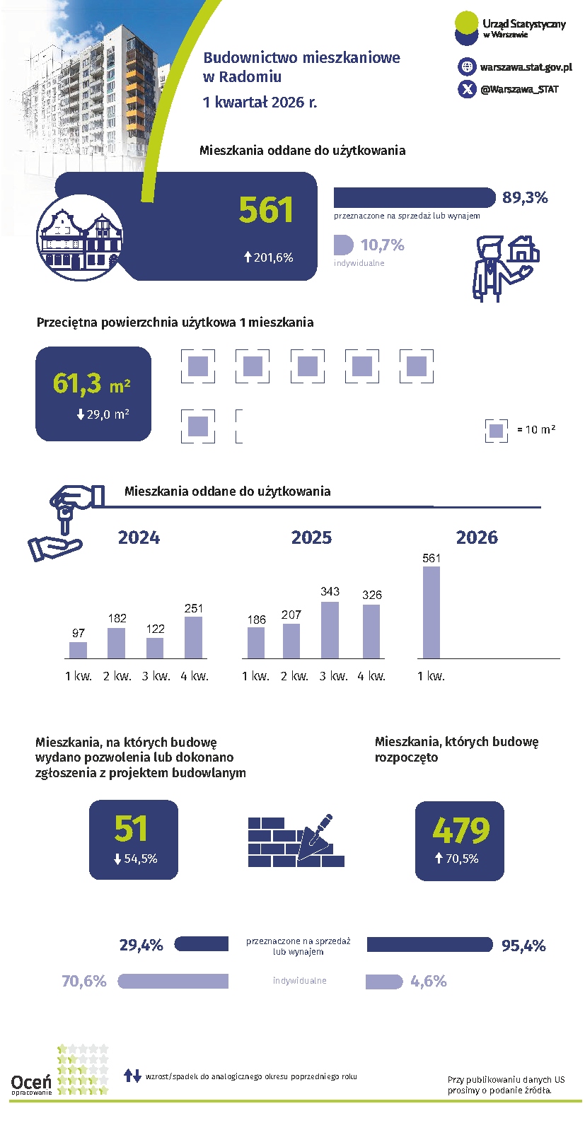 Budownictwo mieszkaniowe w Radomiu w 1 kwartale 2026 r. A A A 29.04.2026 Oceń opracowanie: Pliki do pobrania Budownictwo mieszkaniowe w Radomiu w 1 kwartale 2026 r. 1.48 MB Budownictwo mieszkaniowe w Radomiu w 1 kwartale 2026 r. - opis alternatywny 0.05 MB Budownictwo mieszkaniowe w Radomiu w 1 kwartale 2026 r. - dane w formacie Excel 0.02 MB Budownictwo mieszkaniowe w Radomiu w 1 kwartale 2026 r. - plik z audiodeskrypcją 0.93 MB Archiwum 2025 Budownictwo mieszkaniowe w Radomiu w 2025 r. Budownictwo mieszkaniowe w Radomiu 1-3 kwartał 2025 r. Budownictwo mieszkaniowe w Radomiu 1 półrocze 2025 r. Budownictwo mieszkaniowe w Radomiu w 1 kwartale 2025 r. 2024 Budownictwo mieszkaniowe w Radomiu w 2024 r. Budownictwo mieszkaniowe w Radomiu 1-3 kwartał 2024 r. Budownictwo mieszkaniowe w Radomiu 1 półrocze 2024 r. Budownictwo mieszkaniowe w Radomiu w 1 kwartale 2024 r. 2023 Budownictwo mieszkaniowe w Radomiu w 2023 r. Budownictwo mieszkaniowe w Radomiu 1-3 kwartał 2023 r. Budownictwo mieszkaniowe w Radomiu 1 półrocze 2023 r. Budownictwo mieszkaniowe w Radomiu w 1 kwartale 2023 r. 2022 Budownictwo mieszkaniowe w Radomiu w 2022 r. Budownictwo mieszkaniowe w Radomiu 1–3 kwartał 2022 r. Budownictwo mieszkaniowe w Radomiu I półrocze 2022 r. Budownictwo mieszkaniowe w Radomiu I kwartał 2022 r. 2021 Budownictwo mieszkaniowe w Radomiu I – IV kwartał 2021 r. Budownictwo mieszkaniowe w Radomiu I – III kwartał 2021 r. Budownictwo mieszkaniowe w Radomiu I półrocze 2021 r. Budownictwo mieszkaniowe w Radomiu I kwartał 2021 r. 2020 Budownictwo mieszkaniowe w Radomiu I-IV kwartał 2020 r. Budownictwo mieszkaniowe w Radomiu I-III kwartał 2020 r. Budownictwo mieszkaniowe w Radomiu w I półroczu 2020 r. Budownictwo mieszkaniowe w Radomiu w I kwartale 2020 r. Tagi radom mieszkania oddane do użytkowania średnia cena mieszkania