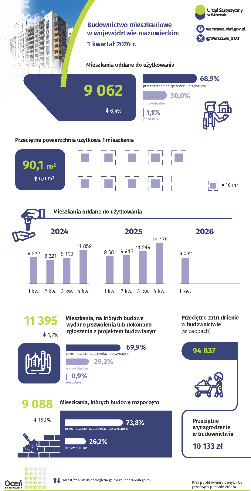 Budownictwo mieszkaniowe w województwie mazowieckim w 1 kwartale 2026 r. A A A 29.04.2026 Oceń opracowanie: Pliki do pobrania Budownictwo mieszkaniowe w województwie mazowieckim w 1 kwartale 2026 r. 0.16 MB Budownictwo mieszkaniowe w województwie mazowieckim w 1 kwartale 2026 r. - opis alternatywny 0.05 MB Budownictwo mieszkaniowe w województwie mazowieckim w 1 kwartale 2026 r. - dane do wykresów w formacie Excel 0.02 MB Budownictwo mieszkaniowe w województwie mazowieckim w 1 kwartale 2026 r. - plik z audiodeskrypcją 1.15 MB Archiwum 2025 Budownictwo mieszkaniowe w województwie mazowieckim w 2025 r. Budownictwo mieszkaniowe w województwie mazowieckim 1-3 kwartał 2025 r. Budownictwo mieszkaniowe w województwie mazowieckim 1 półrocze 2025 r. Budownictwo mieszkaniowe w województwie mazowieckim w 1 kwartale 2025 r. 2024 Budownictwo mieszkaniowe w województwie mazowieckim w 2024 r. Budownictwo mieszkaniowe w województwie mazowieckim 1-3 kwartał 2024 r. Budownictwo mieszkaniowe w województwie mazowieckim 1 półrocze 2024 r. Budownictwo mieszkaniowe w województwie mazowieckim w 1 kwartale 2024 r. 2023 Budownictwo mieszkaniowe w województwie mazowieckim w 2023 r. Budownictwo mieszkaniowe w województwie mazowieckim 1-3 kwartał 2023 r. Budownictwo mieszkaniowe w województwie mazowieckim 1 półrocze 2023 r. Budownictwo mieszkaniowe w województwie mazowieckim w 1 kwartale 2023 r. 2022 Budownictwo mieszkaniowe w województwie mazowieckim w 2022 r. Budownictwo mieszkaniowe w województwie mazowieckim 1–3 kwartał 2022 r. Budownictwo mieszkaniowe w województwie mazowieckim I półrocze 2022 r. Budownictwo mieszkaniowe w województwie mazowieckim I kwartał 2022 r. 2021 Budownictwo mieszkaniowe w województwie mazowieckim I – IV kwartał 2021 r. Budownictwo mieszkaniowe w województwie mazowieckim I – III kwartał 2021 r. Budownictwo mieszkaniowe w województwie mazowieckim I półrocze 2021 r. Budownictwo mieszkaniowe w województwie mazowieckim I kwartał 2021 r. 2020 Budownictwo mieszkaniowe w województwie mazowieckim I-IV kwartał 2020 r. Budownictwo mieszkaniowe w województwie mazowieckim I-III kwartał 2020 r. Budownictwo mieszkaniowe w województwie mazowieckim w I półroczu 2020 r. Budownictwo mieszkaniowe w województwie mazowieckim w I kwartale 2020 r. 2019 Budownictwo mieszkaniowe I-IV kwartał 2019 r. Budownictwo mieszkaniowe w województwie mazowieckim I-III kwartał 2019 r. Budownictwo mieszkaniowe w województwie mazowieckim w I półroczu 2019 r. Budownictwo mieszkaniowe w województwie mazowieckim w I kwartale 2019 r. 2018 Budownictwo mieszkaniowe w województwie mazowieckim w 2018 r. Budownictwo mieszkaniowe w województwie mazowieckim I-III kwartał 2018 r. Budownictwo mieszkaniowe w województwie mazowieckim w I półroczu 2018 r. Budownictwo mieszkaniowe w województwie mazowieckim w I kwartale 2018 r. 2017 Budownictwo mieszkaniowe w województwie mazowieckim w 2017 r. Budownictwo mieszkaniowe w województwie mazowieckim I-III kwartał 2017 r. Budownictwo mieszkaniowe w województwie mazowieckim w I półroczu 2017 r. Budownictwo mieszkaniowe w województwie mazowieckim w I kwartale 2017 r. 2016 Budownictwo mieszkaniowe w województwie mazowieckim w 2016 r. Budownictwo mieszkaniowe w województwie mazowieckim I-III kwartał 2016 r. 1.05 MB Budownictwo mieszkaniowe w województwie mazowieckim w I półroczu 2016 r. 1.11 MB Budownictwo mieszkaniowe w województwie mazowieckim w I kwartale 2016 r. 0.81 MB 2015 Budownictwo mieszkaniowe w województwie mazowieckim w 2015 r. 1.04 MB Mieszkania oddane do użytkowania I-III kwartał 2015 r. 1.95 MB Mieszkania oddane do użytkowania w I półroczu 2015 r. 1.02 MB Mieszkania oddane do użytkowania w I kwartale 2015 r. 1.00 MB 2014 Mieszkania oddane do użytkowania w 2014 r. 0.89 MB Mieszkania oddane do użytkowania I-III kwartał 2014 r. 0.80 MB Mieszkania oddane do użytkowania w I półroczu 2014 r. 0.89 MB Mieszkania oddane do użytkowania w I kwartale 2014 r. 1.99 MB 2013 Mieszkania oddane do użytkowania w 2013 r. 0.72 MB Mieszkania oddane do użytkowania w I-III kwartale 2013 r. 0.94 MB Mieszkania oddane do użytkowania w I półroczu 2013 r. 0.92 MB Mieszkania oddane do użytkowania w I kwartale 2013 r. 0.95 MB 2012 Mieszkania oddane do użytkowania (I-IV kwartał 2012 r.) 3.79 MB 2011 Mieszkania oddane do użytkowania (I-IV kwartał 2011 r.) 4.50 MB 2010 Mieszkania oddane do użytkowania (I-IV kwartał 2010 r.) 4.70 MB 2009 Mieszkania oddane do użytkowania (I-IV kwartał 2009 r.) 2.00 MB 2008 Mieszkania oddane do użytkowania (I-IV kwartał 2008 r.) 2.08 MB Tagi mieszkania budownictwo