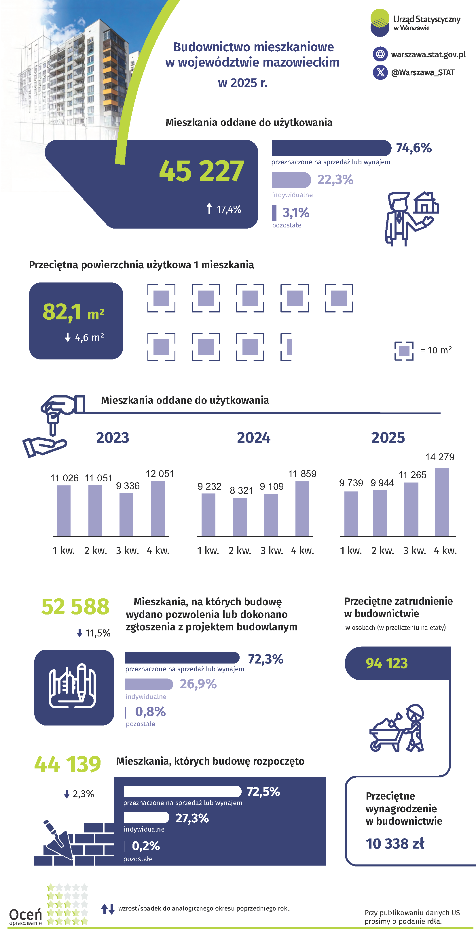 Budownictwo mieszkaniowe w województwie mazowieckim w 2025 r. A A A 29.01.2026 Oceń opracowanie: Pliki do pobrania Budownictwo mieszkaniowe w województwie mazowieckim w 2025 r. 0.27 MB Budownictwo mieszkaniowe w województwie mazowieckim w 2025 r. - opis alternatywny 0.05 MB Budownictwo mieszkaniowe w województwie mazowieckim w 2025 r. - dane w formacie Excel 0.02 MB Budownictwo mieszkaniowe w województwie mazowieckim w 2025 r. - plik z audiodeskrypcją 1.09 MB Archiwum 2025 Budownictwo mieszkaniowe w województwie mazowieckim 1-3 kwartał 2025 r. Budownictwo mieszkaniowe w województwie mazowieckim 1 półrocze 2025 r. Budownictwo mieszkaniowe w województwie mazowieckim w 1 kwartale 2025 r. 2024 Budownictwo mieszkaniowe w województwie mazowieckim w 2024 r. Budownictwo mieszkaniowe w województwie mazowieckim 1-3 kwartał 2024 r. Budownictwo mieszkaniowe w województwie mazowieckim 1 półrocze 2024 r. Budownictwo mieszkaniowe w województwie mazowieckim w 1 kwartale 2024 r. 2023 Budownictwo mieszkaniowe w województwie mazowieckim w 2023 r. Budownictwo mieszkaniowe w województwie mazowieckim 1-3 kwartał 2023 r. Budownictwo mieszkaniowe w województwie mazowieckim 1 półrocze 2023 r. Budownictwo mieszkaniowe w województwie mazowieckim w 1 kwartale 2023 r. 2022 Budownictwo mieszkaniowe w województwie mazowieckim w 2022 r. Budownictwo mieszkaniowe w województwie mazowieckim 1–3 kwartał 2022 r. Budownictwo mieszkaniowe w województwie mazowieckim I półrocze 2022 r. Budownictwo mieszkaniowe w województwie mazowieckim I kwartał 2022 r. 2021 Budownictwo mieszkaniowe w województwie mazowieckim I – IV kwartał 2021 r. Budownictwo mieszkaniowe w województwie mazowieckim I – III kwartał 2021 r. Budownictwo mieszkaniowe w województwie mazowieckim I półrocze 2021 r. Budownictwo mieszkaniowe w województwie mazowieckim I kwartał 2021 r. 2020 Budownictwo mieszkaniowe w województwie mazowieckim I-IV kwartał 2020 r. Budownictwo mieszkaniowe w województwie mazowieckim I-III kwartał 2020 r. Budownictwo mieszkaniowe w województwie mazowieckim w I półroczu 2020 r. Budownictwo mieszkaniowe w województwie mazowieckim w I kwartale 2020 r. 2019 Budownictwo mieszkaniowe I-IV kwartał 2019 r. Budownictwo mieszkaniowe w województwie mazowieckim I-III kwartał 2019 r. Budownictwo mieszkaniowe w województwie mazowieckim w I półroczu 2019 r. Budownictwo mieszkaniowe w województwie mazowieckim w I kwartale 2019 r. 2018 Budownictwo mieszkaniowe w województwie mazowieckim w 2018 r. Budownictwo mieszkaniowe w województwie mazowieckim I-III kwartał 2018 r. Budownictwo mieszkaniowe w województwie mazowieckim w I półroczu 2018 r. Budownictwo mieszkaniowe w województwie mazowieckim w I kwartale 2018 r. 2017 Budownictwo mieszkaniowe w województwie mazowieckim w 2017 r. Budownictwo mieszkaniowe w województwie mazowieckim I-III kwartał 2017 r. Budownictwo mieszkaniowe w województwie mazowieckim w I półroczu 2017 r. Budownictwo mieszkaniowe w województwie mazowieckim w I kwartale 2017 r. 2016 Budownictwo mieszkaniowe w województwie mazowieckim w 2016 r. Budownictwo mieszkaniowe w województwie mazowieckim I-III kwartał 2016 r. 1.05 MB Budownictwo mieszkaniowe w województwie mazowieckim w I półroczu 2016 r. 1.11 MB Budownictwo mieszkaniowe w województwie mazowieckim w I kwartale 2016 r. 0.81 MB 2015 Budownictwo mieszkaniowe w województwie mazowieckim w 2015 r. 1.04 MB Mieszkania oddane do użytkowania I-III kwartał 2015 r. 1.95 MB Mieszkania oddane do użytkowania w I półroczu 2015 r. 1.02 MB Mieszkania oddane do użytkowania w I kwartale 2015 r. 1.00 MB 2014 Mieszkania oddane do użytkowania w 2014 r. 0.89 MB Mieszkania oddane do użytkowania I-III kwartał 2014 r. 0.80 MB Mieszkania oddane do użytkowania w I półroczu 2014 r. 0.89 MB Mieszkania oddane do użytkowania w I kwartale 2014 r. 1.99 MB 2013 Mieszkania oddane do użytkowania w 2013 r. 0.72 MB Mieszkania oddane do użytkowania w I-III kwartale 2013 r. 0.94 MB Mieszkania oddane do użytkowania w I półroczu 2013 r. 0.92 MB Mieszkania oddane do użytkowania w I kwartale 2013 r. 0.95 MB 2012 Mieszkania oddane do użytkowania (I-IV kwartał 2012 r.) 3.79 MB 2011 Mieszkania oddane do użytkowania (I-IV kwartał 2011 r.) 4.50 MB 2010 Mieszkania oddane do użytkowania (I-IV kwartał 2010 r.) 4.70 MB 2009 Mieszkania oddane do użytkowania (I-IV kwartał 2009 r.) 2.00 MB 2008 Mieszkania oddane do użytkowania (I-IV kwartał 2008 r.) 2.08 MB Tagi mieszkania budownictwo
