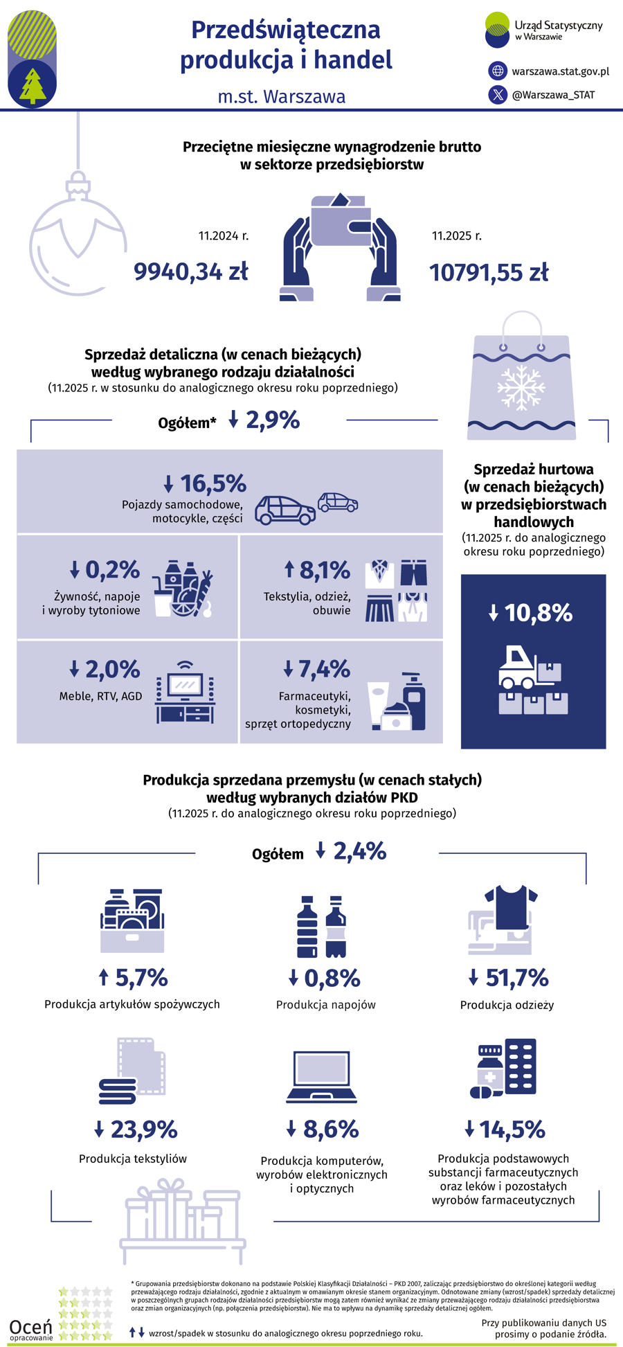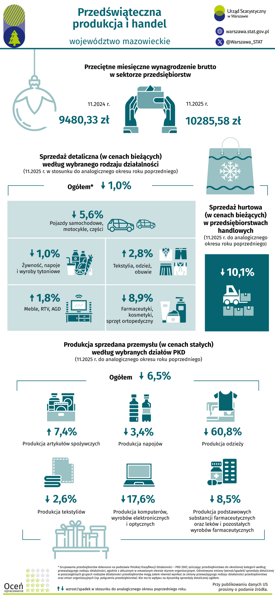Przedświąteczna produkcja i handel A A A 23.12.2025 Oceń opracowanie: Pliki do pobrania Przedświąteczna produkcja i handel - woj. mazowieckie 1.41 MB Przedświąteczna produkcja i handel - Warszawa 1.42 MB Przedświąteczna produkcja i handel - dane w formacie Excel 0.02 MB Przedświąteczna produkcja i handel - woj. mazowieckie, opis alternatywny 0.01 MB Przedświąteczna produkcja i handel - Warszawa, opis alternatywny 0.01 MB Przedświąteczna produkcja i handel - woj. mazowieckie, plik z audiodeskrypcją 1.12 MB Przedświąteczna produkcja i handel - Warszawa, plik z audiodeskrypcją 1.10 MB Archiwum 2024 Przedświąteczna produkcja i handel 2023 Przedświąteczna produkcja i handel 2022 Boże Narodzenie 2021 Boże Narodzenie 2020 Boże Narodzenie 2019 Boże Narodzenie. Ceny detaliczne wybranych towarów i usług 2018 Boże Narodzenie. Ceny detaliczne wybranych towarów i usług 2017 Boże Narodzenie. Ceny detaliczne wybranych towarów 2016 Boże Narodzenie. Ceny detaliczne wybranych towarów 2015 Boże narodzenie. Ceny detaliczne wybranych towarów 0.45 MB 2014 Boże narodzenie. Ceny detaliczne wybranych towarów 0.51 MB 2013 Boże narodzenie. Ceny detaliczne wybranych towarów 0.46 MB 2012 Boże narodzenie. Ceny detaliczne wybranych towarów 0.73 MB 2011 Boże narodzenie. Ceny detaliczne wybranych towarów 0.60 MB 2010 Boże narodzenie. Ceny detaliczne wybranych towarów 0.28 MB 2009 Boże narodzenie. Ceny detaliczne wybranych towarów 0.42 MB Tagi ceny wynagrodzenia