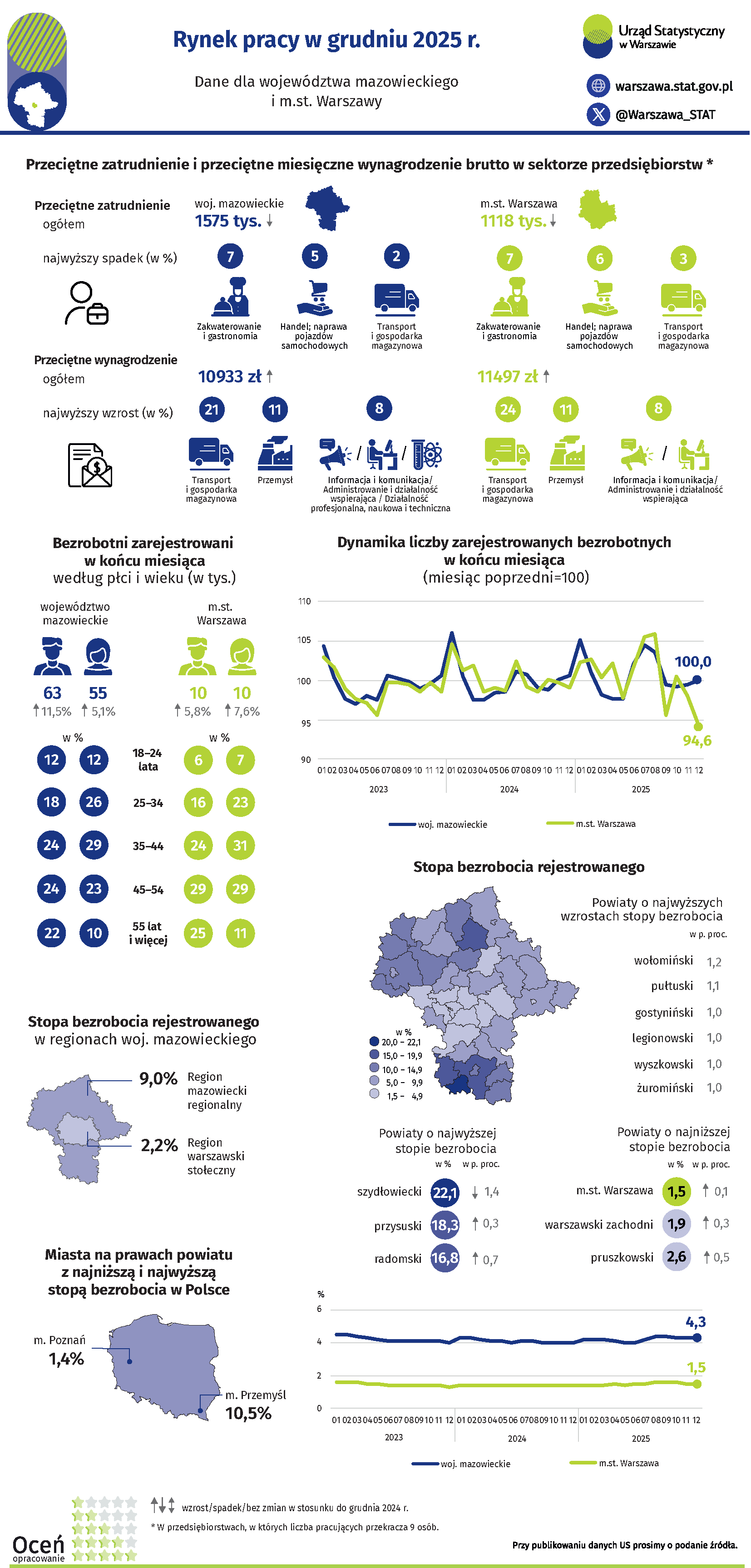 Rynek pracy w grudniu 2025 r. A A A 30.01.2026 Oceń opracowanie: Pliki do pobrania Rynek pracy w grudniu 2025 r. 1.66 MB Rynek pracy w grudniu 2025 r. - opis alternatywny 0.02 MB Rynek pracy w grudniu 2025 r. - dane do map w formacie Excel 0.05 MB Rynek pracy w grudniu 2025 r. - dane do wykresów w formacie Excel 0.06 MB Rynek pracy w grudniu 2025 r. - plik z audiodeskrycją 2.78 MB Archiwum 2025 Rynek pracy w listopadzie 2025 r. Rynek pracy w październiku 2025 r. Rynek pracy we wrześniu 2025 r. Rynek pracy w sierpniu 2025 r. Rynek pracy w lipcu 2025 r. Rynek pracy w czerwcu 2025 r. Rynek pracy w maju 2025 r. Rynek pracy w kwietniu 2025 r. Rynek pracy w marcu 2025 r. Rynek pracy w lutym 2025 r. Rynek pracy w styczniu 2025 r. 2024 Rynek pracy w grudniu 2024 r. Rynek pracy w listopadzie 2024 r. Rynek pracy w październiku 2024 r. Rynek pracy we wrześniu 2024 r. Rynek pracy w sierpniu 2024 r. Rynek pracy w lipcu 2024 r. Rynek pracy w czerwcu 2024 r. Rynek pracy w maju 2024 r. Rynek pracy w kwietniu 2024 r. Rynek pracy w marcu 2024 r. Rynek pracy w lutym 2024 r. Rynek pracy w styczniu 2024 r. 2023 Rynek pracy w grudniu 2023 r. Rynek pracy w listopadzie 2023 r. Rynek pracy w październiku 2023 r. Rynek pracy we wrześniu 2023 r. Rynek pracy w sierpniu 2023 r. Rynek pracy w lipcu 2023 r. Rynek pracy w czerwcu 2023 r. Rynek pracy w maju 2023 r. Rynek pracy w kwietniu 2023 r. Rynek pracy w marcu 2023 r. Rynek pracy w lutym 2023 r. Rynek pracy w styczniu 2023 r. 2022 Rynek pracy w grudniu 2022 r. Rynek pracy w listopadzie 2022 r. Rynek pracy w październiku 2022 r. Rynek pracy we wrześniu 2022 r. Rynek pracy w sierpniu 2022 r. Rynek pracy w lipcu 2022 r. Rynek pracy w czerwcu 2022 r. Rynek pracy w maju 2022 r. Rynek pracy w kwietniu 2022 r. Rynek pracy w marcu 2022 r. Rynek pracy w lutym 2022 r. Rynek pracy w styczniu 2022 r. 2021 Rynek pracy w grudniu 2021 r. Rynek pracy w listopadzie 2021 r. Rynek pracy w październiku 2021 r. Rynek pracy we wrześniu 2021 r. Rynek pracy w sierpniu 2021 r. Rynek pracy w lipcu 2021 r. Rynek pracy w czerwcu 2021 r. Rynek pracy w maju 2021 r. Rynek pracy w kwietniu 2021 r. Rynek pracy w marcu 2021 r. Rynek pracy w lutym 2021 r. Rynek pracy w styczniu 2021 r. 2020 Rynek pracy w grudniu 2020 r. Rynek pracy w listopadzie 2020 r. Rynek pracy w październiku 2020 r. Rynek pracy we wrześniu 2020 r. Rynek pracy w sierpniu 2020 r. Rynek pracy w lipcu 2020 r. Rynek pracy w czerwcu 2020 r. Rynek pracy w maju 2020 r. Rynek pracy w kwietniu 2020 r. Rynek pracy w marcu 2020 r. Rynek pracy w lutym 2020 r. Rynek pracy w styczniu 2020 r. 2019 Rynek pracy w grudniu 2019 r. Rynek pracy w listopadzie 2019 r. Rynek pracy w październiku 2019 r. Rynek pracy we wrześniu 2019 r. Rynek pracy w sierpniu 2019 r. Rynek pracy w lipcu 2019 r. Rynek pracy w czerwcu 2019 r. Rynek pracy w maju 2019 r. Rynek pracy w kwietniu 2019 r. Rynek pracy w marcu 2019 r. Rynek pracy w lutym 2019 r. Rynek pracy w styczniu 2019 r. 2018 Rynek pracy w grudniu 2018 r. Rynek pracy w listopadzie 2018 r. Rynek pracy w październiku 2018 r. Rynek pracy we wrześniu 2018 r. Rynek pracy w sierpniu 2018 r. Rynek pracy w lipcu 2018 r. Rynek pracy w czerwcu 2018 r. Rynek pracy w maju 2018 r. Rynek pracy w kwietniu 2018 r. Rynek pracy w marcu 2018 r. Rynek pracy w lutym 2018 r. Rynek pracy w styczniu 2018 r. 2017 Rynek pracy w grudniu 2017 r. Rynek pracy w listopadzie 2017 r. Rynek pracy w październiku 2017 r. Rynek pracy we wrześniu 2017 r. Rynek pracy w sierpniu 2017 r. Rynek pracy w lipcu 2017 r. Rynek pracy w czerwcu 2017 r. Rynek pracy w maju 2017 r. Rynek pracy w kwietniu 2017 r. Rynek pracy w marcu 2017 r. Rynek pracy w styczniu 2017 r. 2016 Rynek pracy w lutym 2017 r. Rynek pracy w grudniu 2016 r. Rynek pracy w listopadzie 2016 r. 0.07 MB Rynek pracy w październiku 2016 r. 0.07 MB Rynek pracy we wrześniu 2016 r. 0.07 MB Rynek pracy w sierpniu 2016 r. 1.41 MB Rynek pracy w lipcu 2016 r. 0.07 MB Rynek pracy w czerwcu 2016 r. 0.07 MB Rynek pracy Mazowsza i Warszawy w maju 2016 r. Rynek pracy Mazowsza i Warszawy w kwietniu 2016 r. 0.06 MB Rynek pracy Mazowsza i Warszawy w marcu 2016 r. 0.06 MB Rynek pracy Mazowsza i Warszawy w lutym 2016 r. 0.06 MB Rynek pracy Mazowsza i Warszawy w styczniu 2016 r. 0.06 MB 2015 Rynek pracy Mazowsza i Warszawy w grudniu 2015 r. 0.06 MB Rynek pracy Mazowsza i Warszawy w listopadzie 2015 r. 0.06 MB Rynek pracy Mazowsza i Warszawy w październiku 2015 r. 0.05 MB Rynek pracy Mazowsza i Warszawy we wrześniu 2015 r. 0.05 MB Rynek pracy Mazowsza i Warszawy w sierpniu 2015 r. 0.05 MB Rynek pracy Mazowsza i Warszawy w lipcu 2015 r. 0.05 MB Rynek pracy Mazowsza i Warszawy w czerwcu 2015 r. 0.05 MB Rynek pracy Mazowsza i Warszawy w maju 2015 r. 0.05 MB Rynek pracy Mazowsza i Warszawy w kwietniu 2015 r. 0.05 MB Rynek pracy Mazowsza i Warszawy w marcu 2015 r. 0.05 MB Rynek pracy Mazowsza i Warszawy w lutym 2015 r. 0.05 MB Rynek pracy Mazowsza i Warszawy w styczniu 2015 r. 0.05 MB 2014 Rynek pracy w grudniu 2014 r. 0.16 MB Rynek pracy we listopadzie 2014 r. 0.16 MB Rynek pracy we październiku 2014 r. 0.16 MB Rynek pracy we wrześniu 2014 r. 0.16 MB Rynek pracy w sierpniu 2014 r. 0.16 MB Rynek pracy w lipcu 2014 r. 0.16 MB Rynek pracy w czerwcu 2014 r. 0.16 MB Rynek pracy w maju 2014 r. 0.16 MB Rynek pracy w kwietniu 2014 r. 0.16 MB Rynek pracy w marcu 2014 r. 0.16 MB Rynek pracy w lutym 2014 r. 0.17 MB Rynek pracy w styczniu 2014 r. 0.16 MB 2013 Rynek pracy (styczeń-grudzień 2013 r.) 4.85 MB 2012 Rynek pracy (styczeń-grudzień 2012 r.) 8.46 MB 2011 Rynek pracy (styczeń-grudzień 2011 r.) 30.40 MB 2010 Rynek pracy (styczeń-grudzień 2010 r.) 34.85 MB 2009 Rynek pracy (styczeń-grudzień 2009 r.) 12.58 MB Tagi rynek pracy zatrudnienie wynagrodzenia bezrobocie rejestrowane stopa bezrobocia