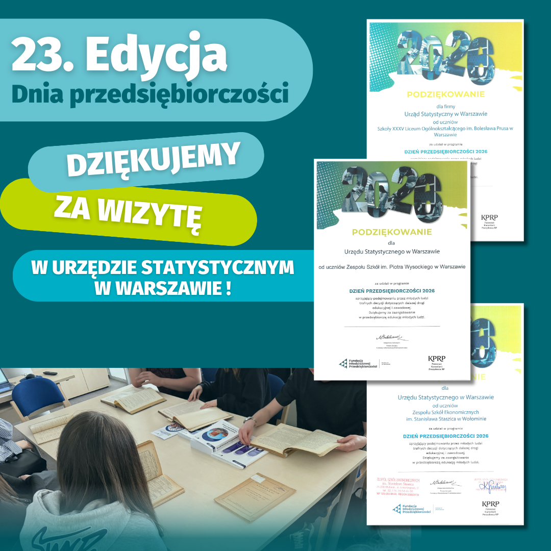 W dniu 18 marca 2026 r. Urząd Statystyczny w Warszawie uczestniczył w 23. edycji Dnia Przedsiębiorczości organizowanego przez Fundację Młodzieżowej Przedsiębiorczości pod patronatem Kancelarii Prezydenta Rzeczypospolitej Polskiej. Ideą programu jest włączenie środowiska przedsiębiorców w edukację młodych ludzi oraz stworzenie nowatorskiej płaszczyzny przekazywania młodzieży wiedzy o funkcjonowaniu na rynku pracy. W trakcie trwania wizyty uczniowie zapoznali się z ogólnymi zasadami funkcjonowania Urzędu, poznali obowiązki przewidziane w zakresie danego stanowiska pracy oraz mogli uczestniczyć w realizacji bieżących zadań. W siedzibie Urzędu Statystycznego w Warszawie w akcji uczestniczyło 25 uczniów z Zespołu Szkół im. P. Wysockiego w Warszawie, Zespołu Szkół Ekonomicznych im. St. Staszica w Wołominie i XXXV Liceum Ogólnokształcące z Oddziałami Dwujęzycznymi im. Bolesława Prusa. W Oddziale Urzędu Statystycznego w Warszawie z siedzibą w Radomiu udział w wydarzeniu wzięły 2 osoby z Zespołu Szkół Spożywczych i Hotelarskich w Radomiu. Opiekę nad uczniami sprawowały 4 konsultantki z Mazowieckiego Ośrodka Badań Regionalnych. Urząd zaproponował uczniom stanowiska z zakresu edukacji statystycznej i promocji oraz udostępniania danych statystycznych. Uczniowie z dużym zaangażowaniem realizowali powierzone im zadania, zdobywając wiedzę o pracy w statystyce publicznej.